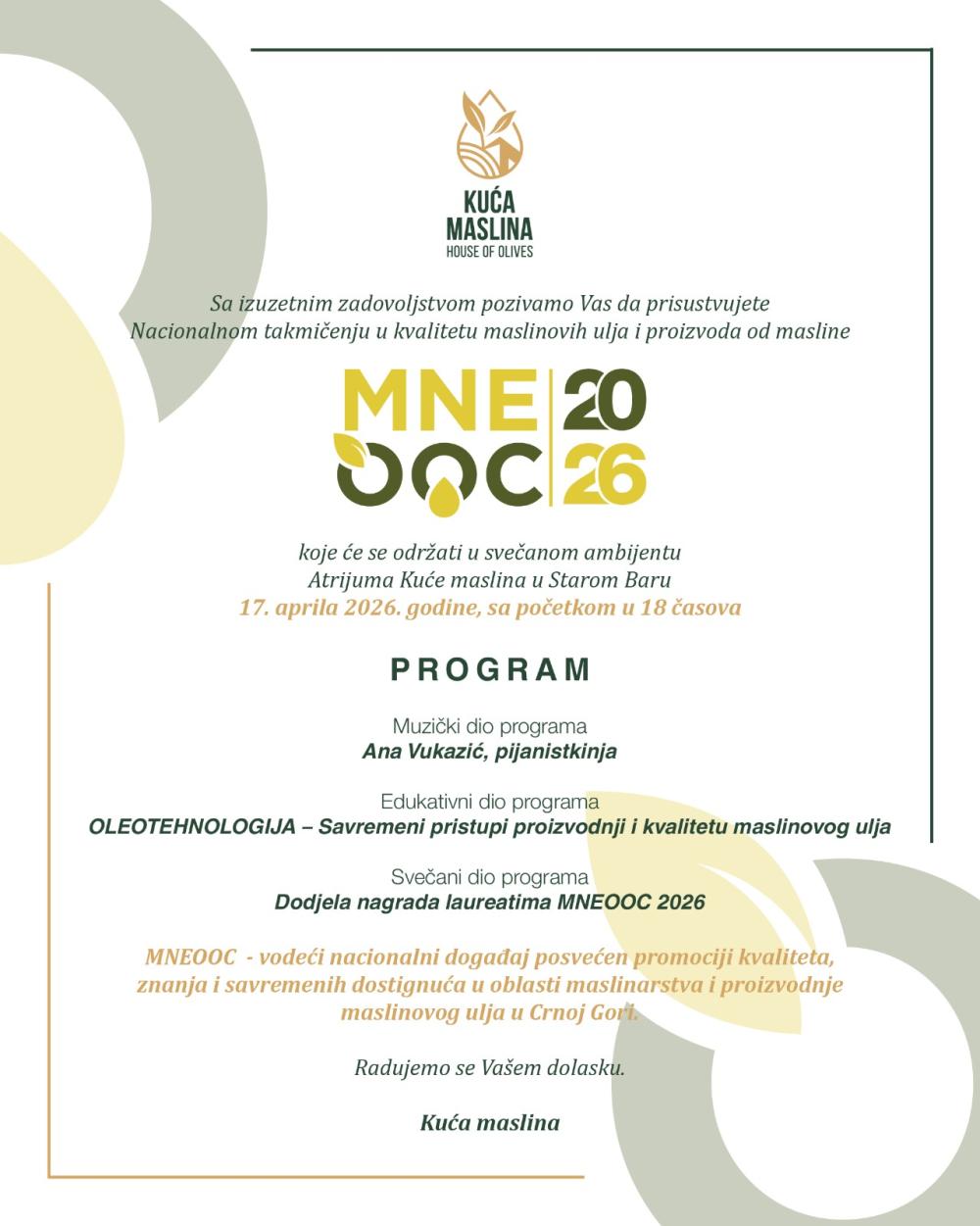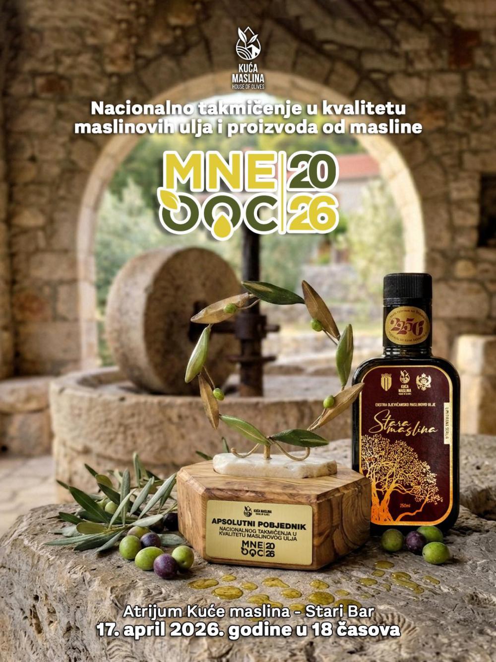 У организацији Куће маслина и под покровитељством Општине Бар, 17. априла 2026. године са почетком у 18 часова, биће одржана свечана додјела награда лауреатима Националног такмичења у квалитету маслинових уља и производа од маслине MNEOOC 2026, једног од најзначајнијих догађаја у области маслинарства у Црној Гори.
