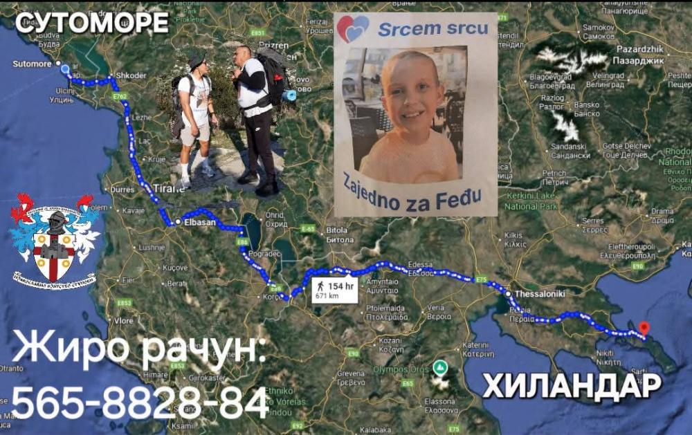 Вођени Божијим призивом и искреном жељом да помогну, чланови Православног братства „Витезови Светог Јована Владимира“ из Бара, Стојан Секуловић и његов братанац Александар Секуловић, кренули су на велико ходочашће пјешке ка светој Гори — манастиру Хиландару. Њихово путовање није само духовни подвиг, већ и хуманитарна мисија — са једним светим циљем: да се прикупи помоћ за малог Феђу Алковића из Подгорице, који се храбро бори за своје оздрављење.