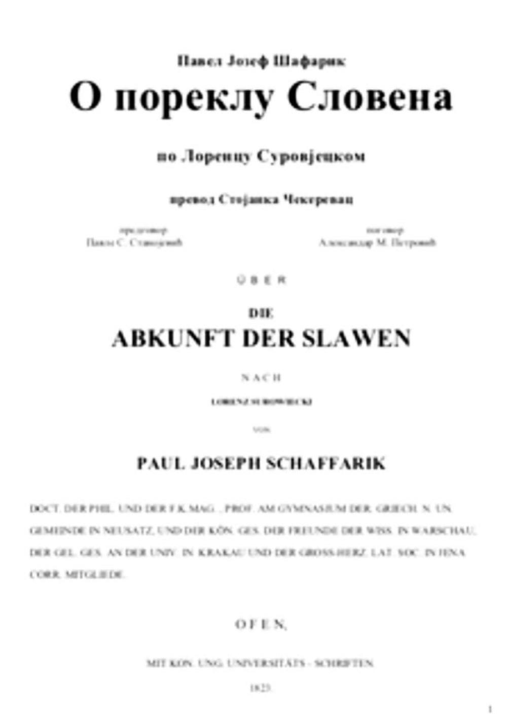 Павле Јосиф Шафарик у "Старожитностима" (I,40.) говорећи о Србима, који живе у Европи од најдавнијих времена, или - што је исто - каже он, од праисторијског доба, тврди, да један тако распрострањен народ води своје порекло од најдаље прошлости. У вези с тим, он прелази на проблем језика и каже (на истом месту), ДА СЕ СЛОВЕНСКИ ЈЕЗИК РАЗВИО САМ ОД СЕБЕ, те да носи у себи и у својим облицима (in Stoff und Form) један тако снажан печат оригиналности, а та чињеница је доказ, да су СЛОВЕНИ - У НЕКУ РУКУ САМОНИКЛИ, НЕ ПОСТАВШИ НИКАКВОМ МЕШАВИНОМ НИТИ У РАСНОМ, КАО НИ У ЈЕЗИЧКОМ СМИСЛУ, што савршено одговара Пиктеовом тврђењу о његовом "давном народу - чистом од сваке мешавине, који се - најмање 2000 година пре Христа пружао од Инда до западне Европе," а који он - упркос толикој бројности, на жалост, није успео да пронађе. Шафарикова - иначе снажна мисао - све је снажнија и уверљивија, јер је њена главна карактеристика логика, заснована на његовом великом језичком познавању. Тако, када устврди, да: