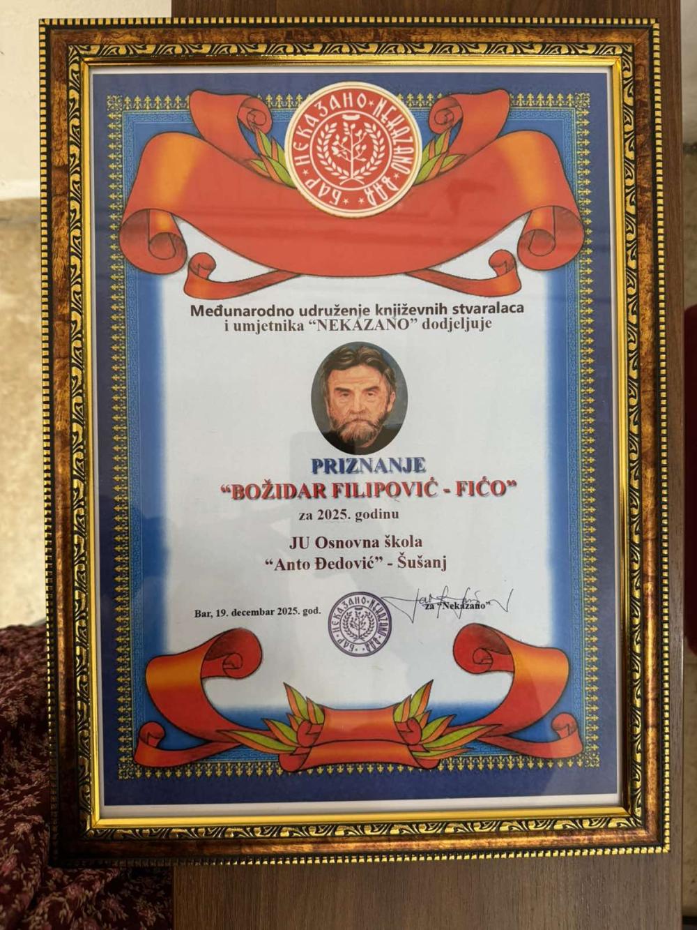 Одлуком Управног одбора, овогодишње признање додијељено је ЈУ Основној школи „Анто Ђедовић“ из Шушња, због изузетног доприноса пројекту и највећег броја квалитетно пристиглих радова. Награду је у име школе примила професорица Аниса Ђокић, уз ријечи захвалности и снажан аплауз присутних.