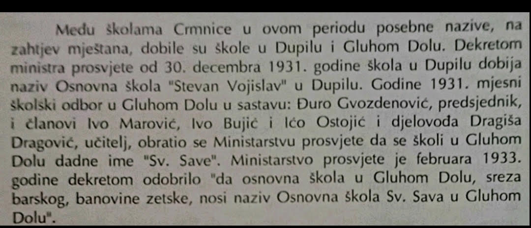 Документа из међуратног периода то потврђују без остатка. Именовање школа у Црмници није било резултат било чије присиле, већ одраз јасног културног и духовног саморазумијевања локалних заједница. Народ је сам бирао своје узоре и своје светионике.