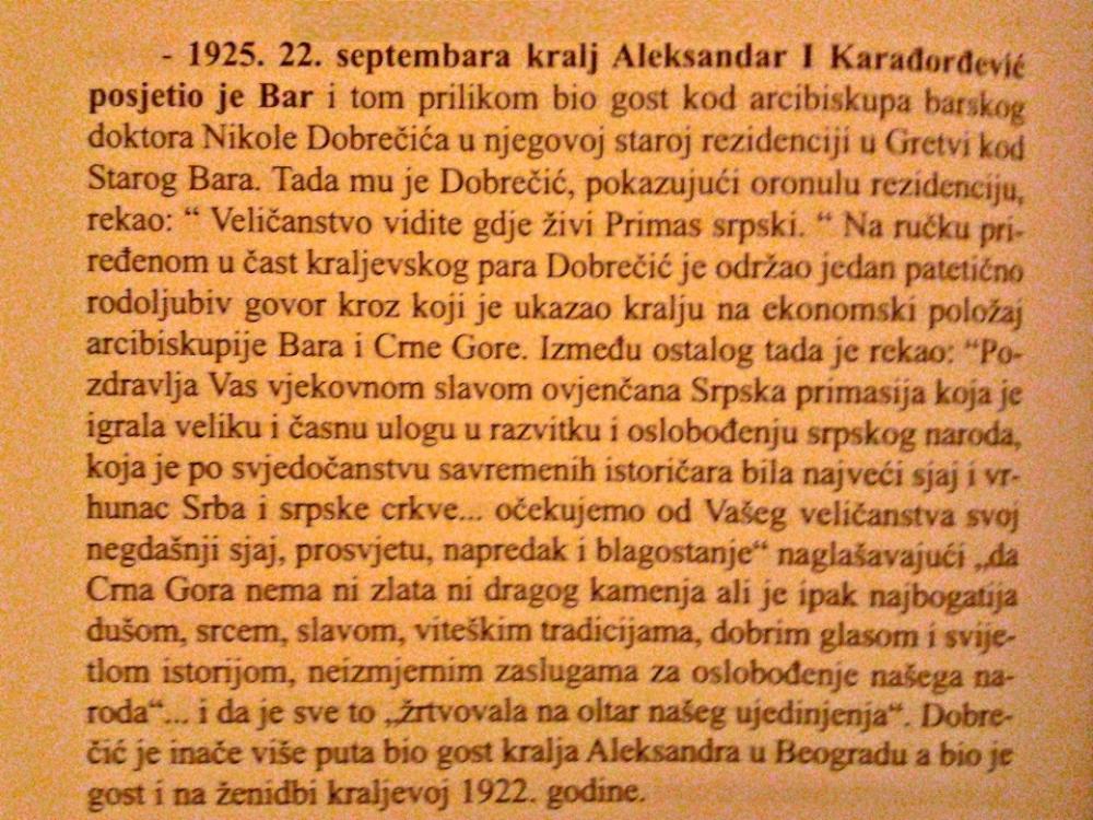 „1925. 22. septembra kralj Aleksandar I Karađorđević posjetio je Bar i tom prilikom bio gost kod arcibiskupa barskog doktora Nikole Dobrečića u njegovoj staroj rezidenciji u Gretvi kod Starog Bara. Tada mu je Dobrečić, pokazujući oronulu rezidenciju, rekao: