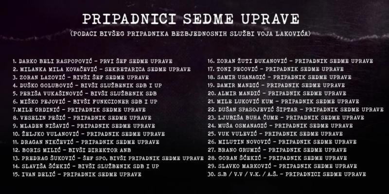 „Među njima se nalaze Darko Beli Raspopović, Milanka Mila Kovačević, sekretarica koja je o svima sve znala, Zoran Lazović, Duško Golubović, Periša Vukašinović, Miško Pejović, Mile Grdinić, Veselin Pešić, Mladen Nišavić i Željko Vulanović. To je prva postava, a kasnije se širila i sa drugim operativcima, ali i sa kriminalcima“, kazao je Laković.