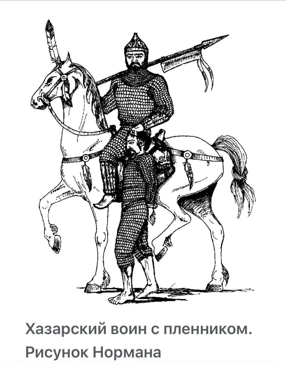 Hazarski ratnik sa zarobljenikom. Crtež Normana Finkelštajna, zasnovan na slici nomada na krčagu iz ostave Nađsentmikloš.