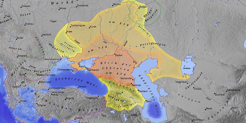 Od sredine sedmog veka Hazari su pokorili ili proterali bugarska plemena iz crnomorskih stepa, dok su istovremeno vodili složen rat sa muslimanskim kalifatom za kontrolu Kavkaza. Godine 737. omejadski general Marvan izveo je iznenadni vojni udar, zarobio hazarskog kagana i privremeno ga preobratio u islam. Ipak, ovo preobraćenje nije imalo trajne posledice, jer muslimanska vojska nije mogla da održi prisustvo na Volgi. Ratovi sa kalifatom, kao i savez sa Vizantijom, uticali su na verski profil Hazarije. Vladajuća elita, nastojeći da odabere monoteističku religiju koja ne bi podrazumevala političku potčinjenost ni kalifu ni vizantijskom caru, opredelila se za judaizam.