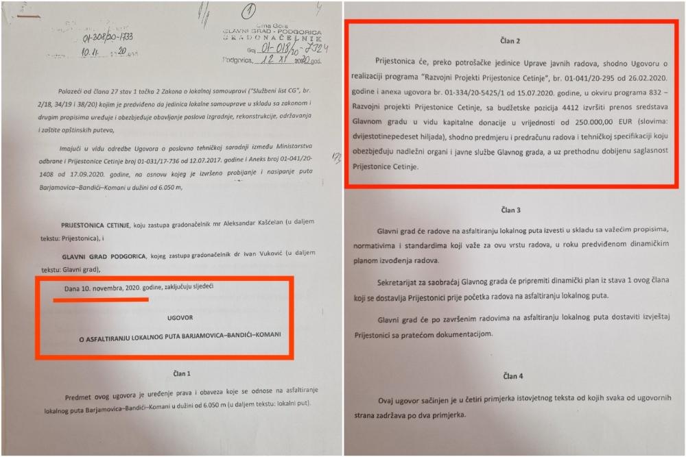 „U osnovnom ugovoru nije bilo puta preko Barjamovice, što je i logično jer se ovo naselje ne nalazi na teritoriji Podgorice. Međutim, samo nekoliko mjeseci kasnije, 13. septembra 2019, Vuković aneksom dodaje stavku o probijanju puta Barjamovica – Komani dužine 6,05 km“, navodi se u saopštenju.