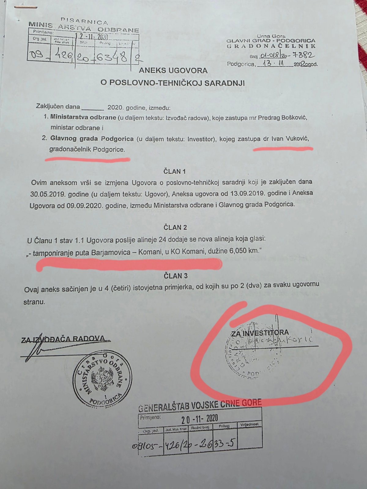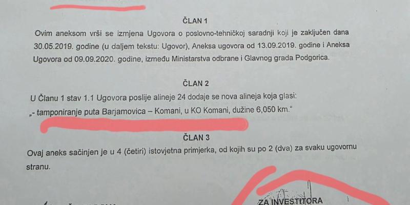 „У основном уговору није било пута преко Барјамовице, што је и логично јер се ово насеље не налази на територији Подгорице. Међутим, само неколико мјесеци касније, 13. септембра 2019, Вуковић анексом додаје ставку о пробијању пута Барјамовица – Комани дужине 6,05 км“, наводи се у саопштењу.