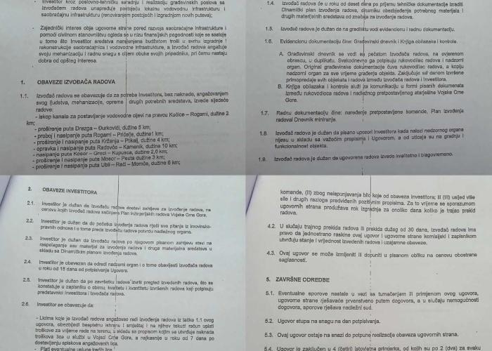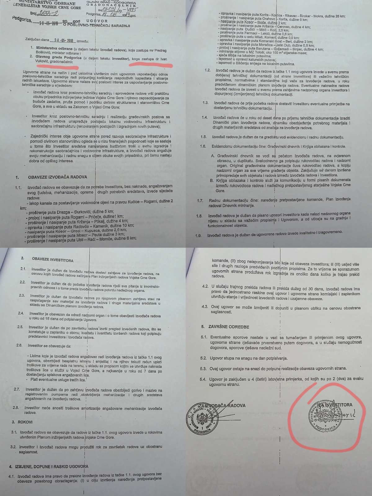 Како се истиче у саопштењу, Вуковић је, иако у првобитном уговору из јула 2017. године није био потписник, 2019. године потписао Уговор о пословно-техничкој сарадњи са тадашњим министром одбране Предрагом Бошковићем. Овим уговором, како тврди Лековић, Војска Црне Горе обавезала се да бесплатно ангажује своје ресурсе на извођењу радова на путним правцима на територији Главног града.