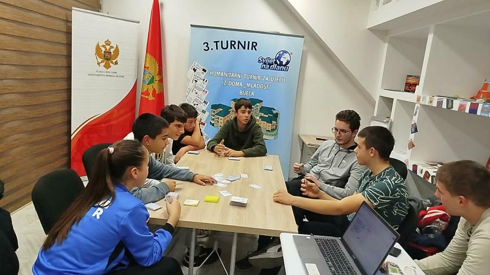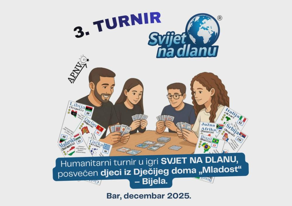 Organizatori podsjećaju da se ovogodišnji tradicionalni turnir u edukativnoj igri „Svjet na dlanu“ u Baru realizuje kao humanitarni događaj, sa ciljem prikupljanja pomoći za djecu bez roditeljskog staranja iz JU Dječiji dom „Mladost“ iz Bijele. Turnir organizuje NVO Akcelerator preduzetništva iz Bara, u saradnji sa autorom igre Aleksandrom Lekićem. U saopštenju se ističe da je tokom grupnih faza turnira, koje su pored Bara održane i u Podgorici, Danilovgradu, Nikšiću i Tivtu, učestvovalo oko 200 takmičara, te da su prikupljena značajna sredstva namijenjena pomoći Dječijem domu „Mladost“ u Bijeloj. Posjetioci će, kako se navodi, i tokom završnice turnira imati priliku da doniraju novčana sredstva ili poklone i na taj način daju lični doprinos ovoj humanitarnoj akciji. Svaka donacija, bez obzira na iznos ili vrstu, predstavlja vrijedan gest i znak pažnje koji djeci mnogo znači, zaključuje se u saopštenju organizatora.