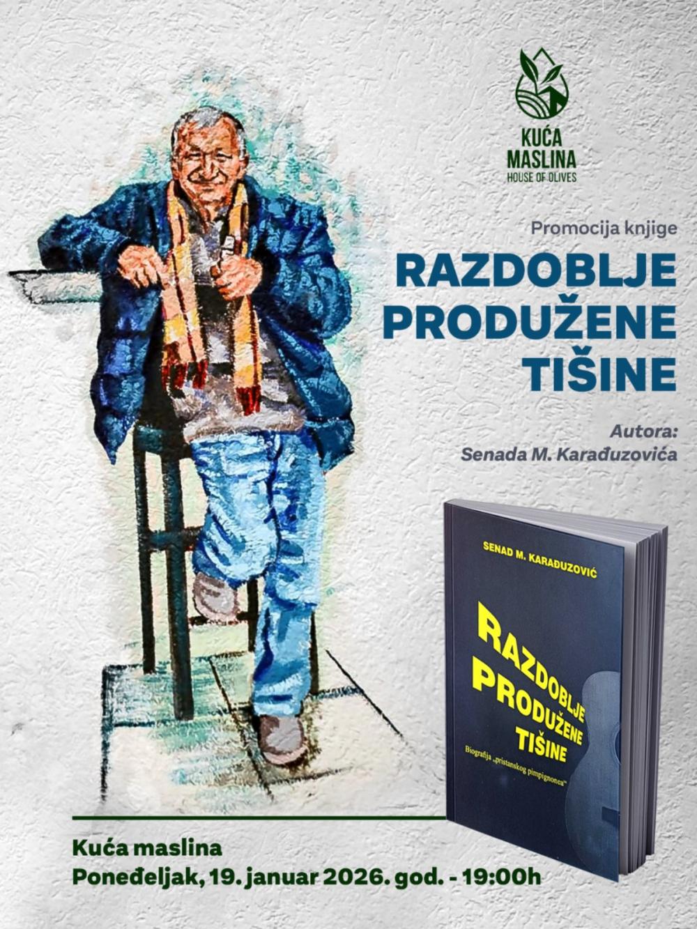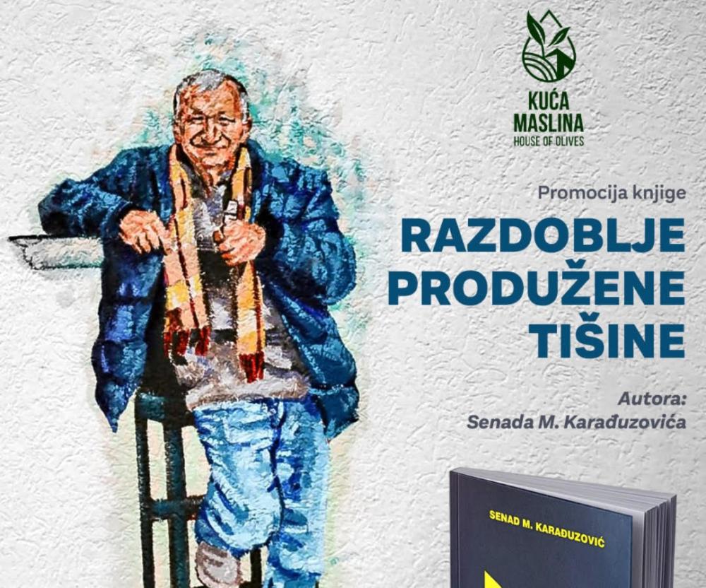U Kući maslina u Baru, u ponedjeljak, 19. januara, sa početkom u 19 časova, biće održana promocija knjige „Razdoblje produžene tišine – biografija pristanskog pimpignonea“, autora Senada M. Karađuzovića, saopšteno je iz Kuće maslina.