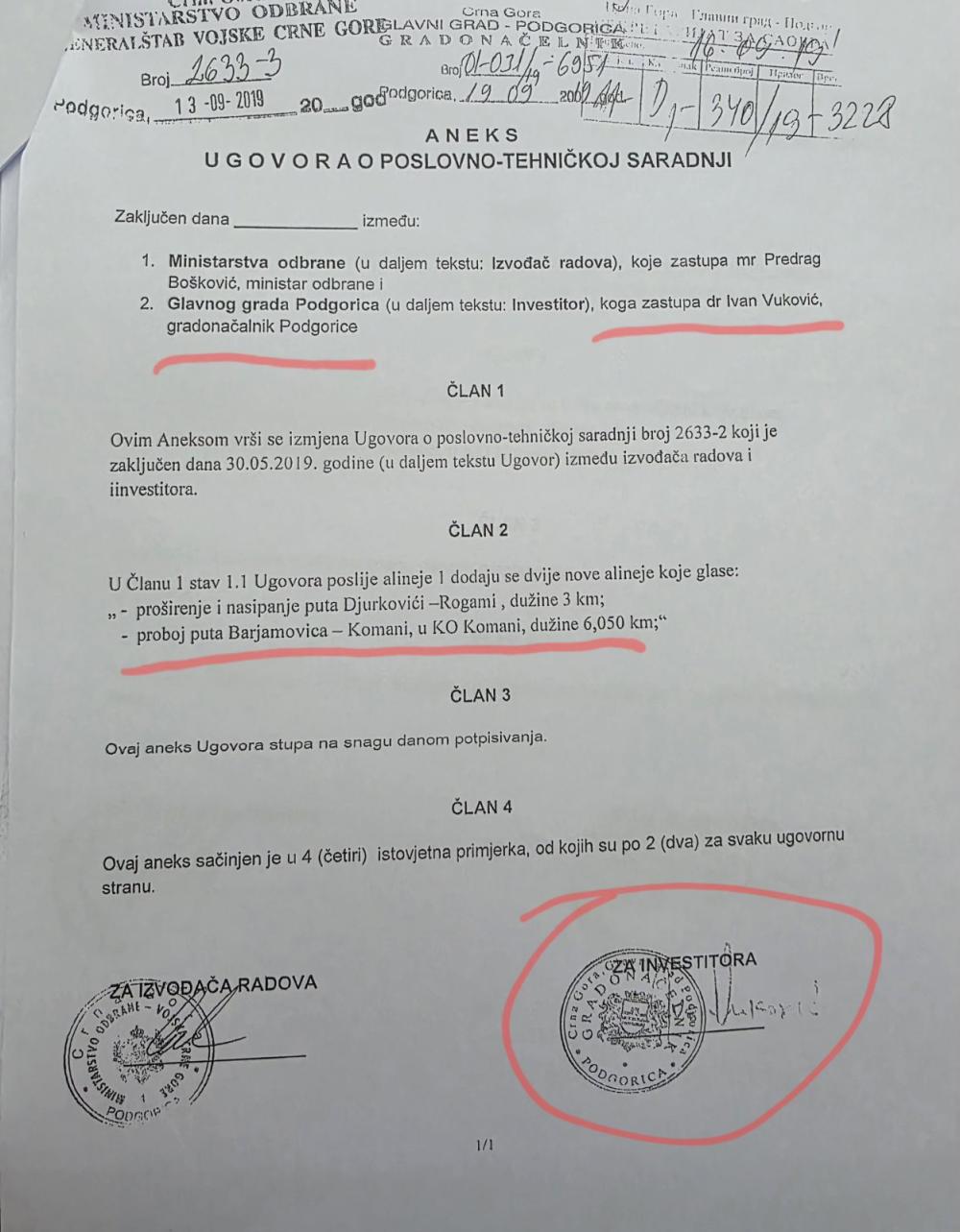 „U osnovnom ugovoru nije bilo puta preko Barjamovice, što je i logično jer se ovo naselje ne nalazi na teritoriji Podgorice. Međutim, samo nekoliko mjeseci kasnije, 13. septembra 2019, Vuković aneksom dodaje stavku o probijanju puta Barjamovica – Komani dužine 6,05 km“, navodi se u saopštenju.