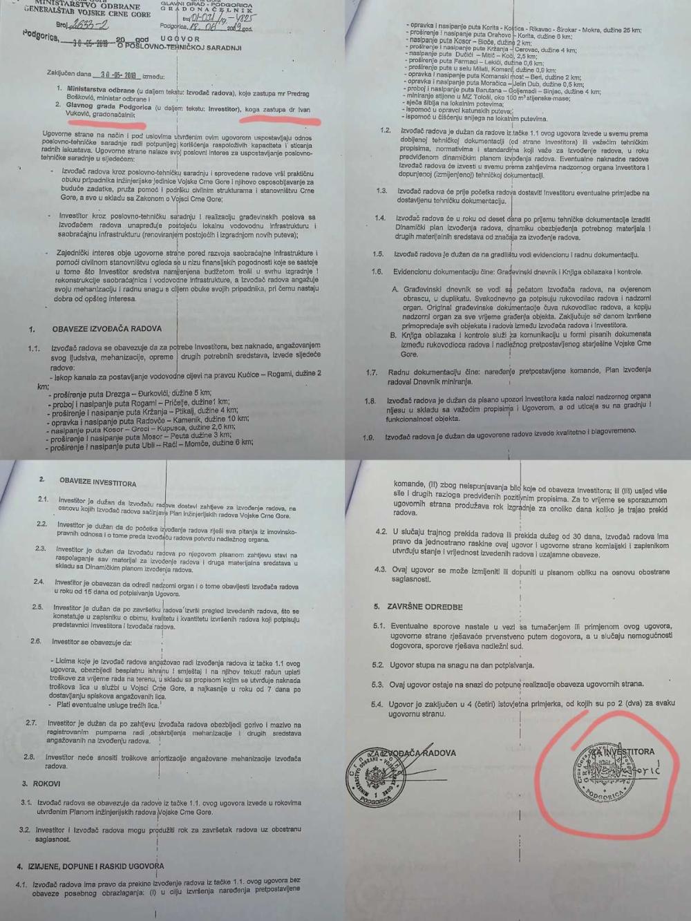 Kako se ističe u saopštenju, Vuković je, iako u prvobitnom ugovoru iz jula 2017. godine nije bio potpisnik, 2019. godine potpisao Ugovor o poslovno-tehničkoj saradnji sa tadašnjim ministrom odbrane Predragom Boškovićem. Ovim ugovorom, kako tvrdi Leković, Vojska Crne Gore obavezala se da besplatno angažuje svoje resurse na izvođenju radova na putnim pravcima na teritoriji Glavnog grada.