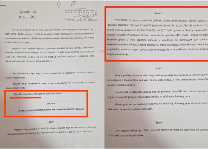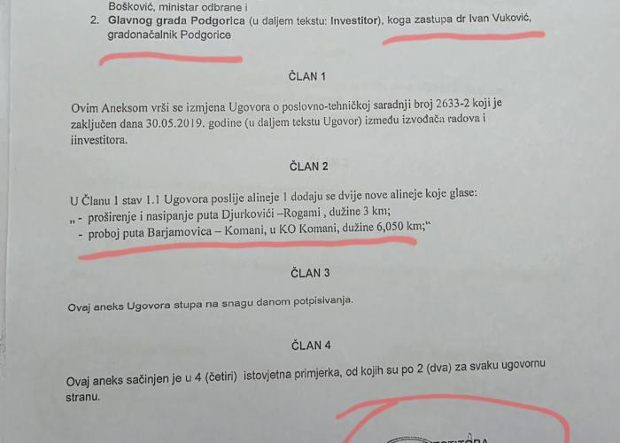 „У основном уговору није било пута преко Барјамовице, што је и логично јер се ово насеље не налази на територији Подгорице. Међутим, само неколико мјесеци касније, 13. септембра 2019, Вуковић анексом додаје ставку о пробијању пута Барјамовица – Комани дужине 6,05 км“, наводи се у саопштењу.